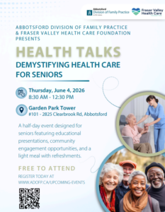 In partnership with Fraser Valley Health Care Foundation, the Abbotsford Division of Family Practice is proud to present Health Talks: Demystifying Health Care for Seniors — a free, community-based health education series designed to bring accessible, culturally relevant health information directly to our neighborhoods.