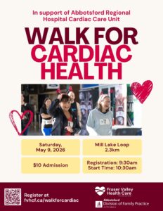 In partnership with Fraser Valley Health Care Foundation, the Abbotsford Division of Family Practice is hosting Walk for Cardiac Health. All are invited to join – whether you’re a jogger, brisk walker, or casual stroller, join us for a beautiful lakeside run or walk at Mill Lake park. Help us fund cardiac programs and equipment at our local hospitals.