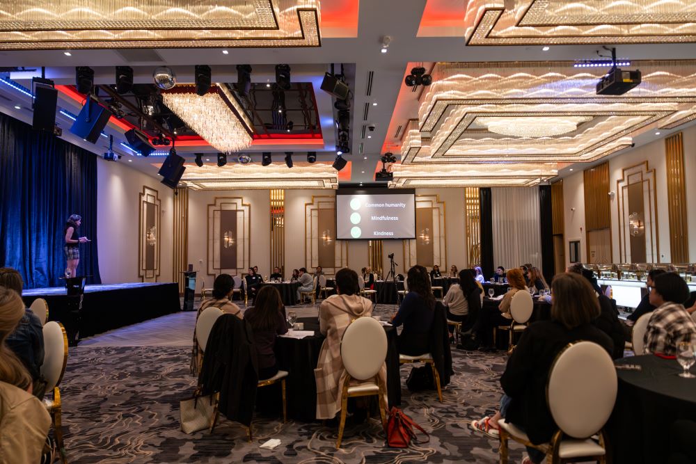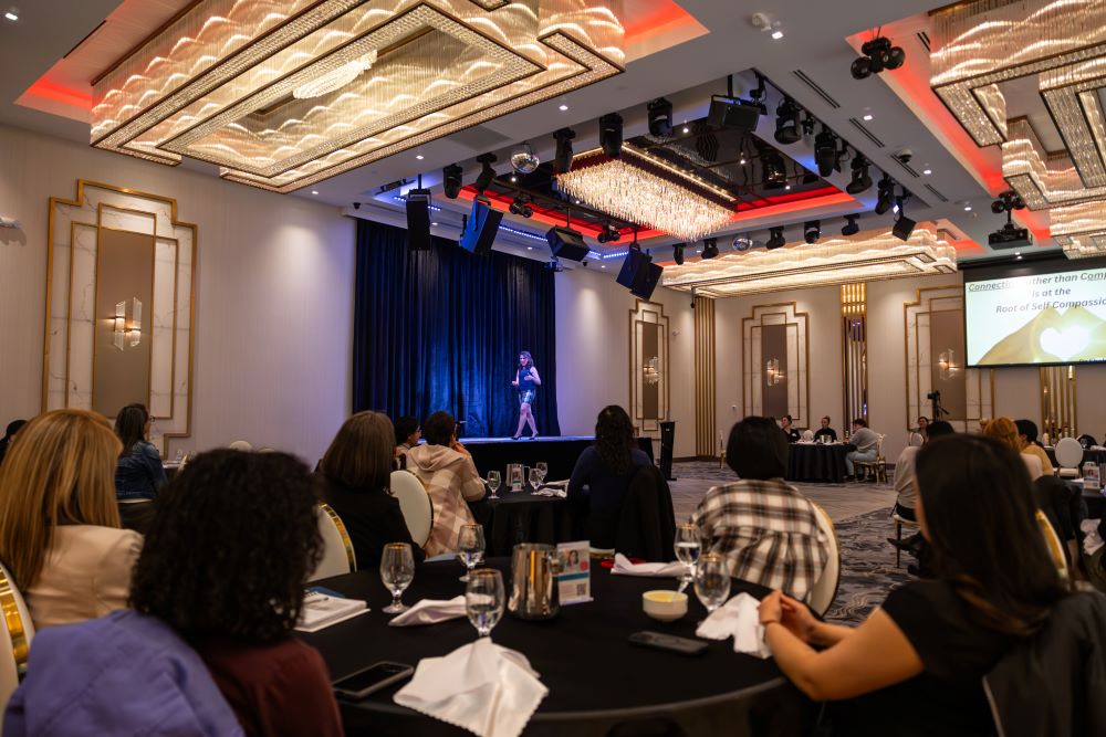 The “antidote” for fear, she says is self-compassion, urging a room-full of female health-care workers to “think better and connect deeply.”